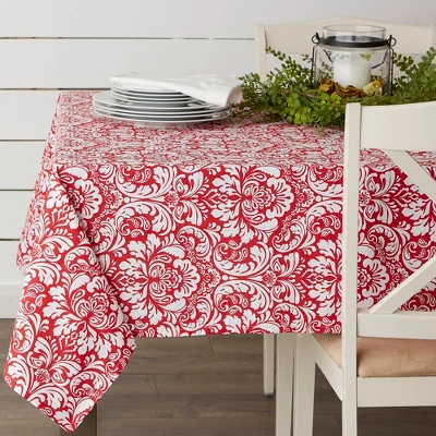 DII’s Tango Red Damask Tablecloth , measures 60×84 inches, appropriate for a table that can seat 6-8 people. Crafted from high quality fabric, machine wash in cold water separately, gentle cycle, line dry to avoid any shrinkage. Low iron if needed. Let your dinnerware stand out with our colorfast wrinkle resistant tablecloths that are sure to make a statement. Your table can be dressed up or down to create the perfect place setting. A classic staple for any kind of entertaining, our tablecloths are perfect for holidays, dinners, parties, banquets, catering, showers, events and more. Adds a beautiful touch to your tablescape.