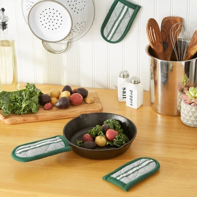 - Set of 3 terry pan handles, each measure 6 x 3 inches. Use with pots, pans, cast iron skillets, fajita skillet or cooking pot. Slides on and off of pan and pot handles easily to keep your hands safe while cooking and baking.