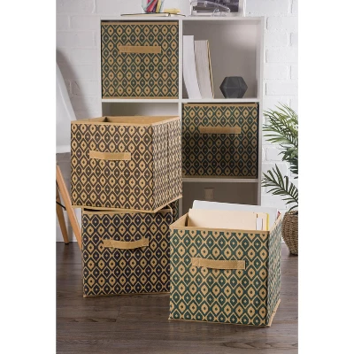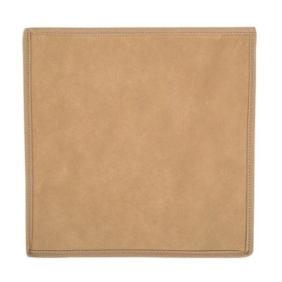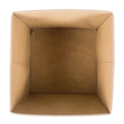 - Non-woven fabric storage bins have cardboard sides and a removable bottom to give shape and add structure while still allowing bins to fold flat when not in use.