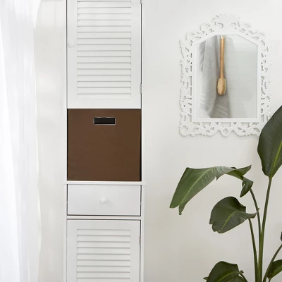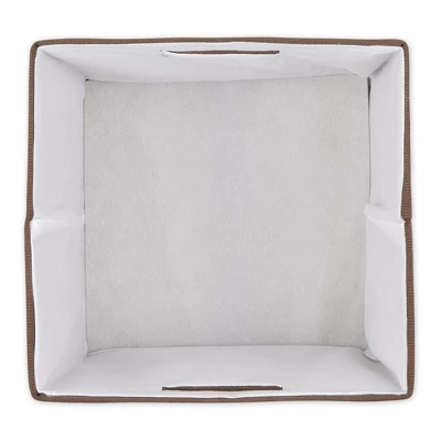 - Wrapped in polyester fabric, storage bins have a cardboard core on sides and bottom to give shape and add structure while still allowing bins to fold flat when not in use.