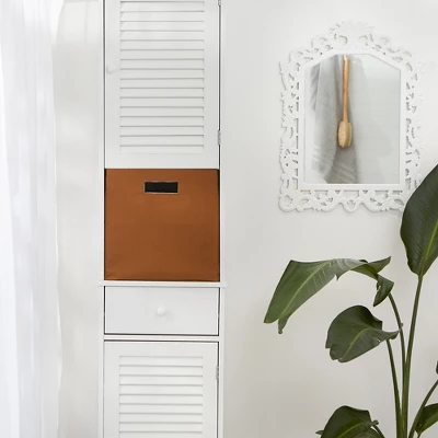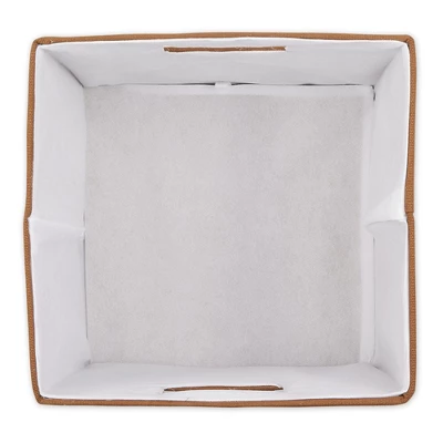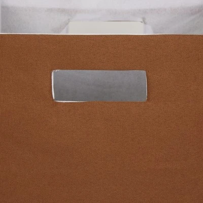 - Wrapped in polyester fabric, storage bins have a cardboard core on sides and bottom to give shape and add structure while still allowing bins to fold flat when not in use.