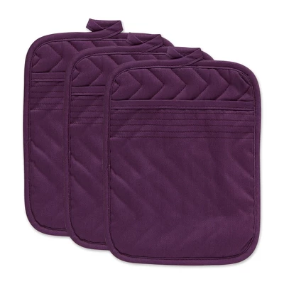 DII 100% Cotton, machine washable, quilted pocket potholder, includes 3 potholders, each measures 7 inches by 9 inches. These wonderfully made potholders are heat resistance, which allows you to remove dishes from the oven and hot pots from the stove. The chino cotton and quilting allows for easy flexibility in this potholder. DII potholder sets are available in many colors to coordinate with your kitchen. This is a must have potholder set for any and every kitchen.