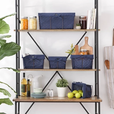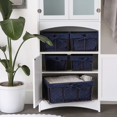 - Set includes 5 bronze wire baskets with removable French blue fabric liners includes 1 Extra Large 18-inches L x 13-inches W x 8-inches H, 2 Medium 11-inches L x 7.88-inches W x 7 H, 2 Small 9-inchesL x 7-inchesW x 6-inchesH