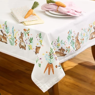 Our Hop into Spring Collection is a symphony of sugar pastels and candy-colored delights. Playful and charming, the palette and playful prints and detailed embellishments evoke the spirit of Easter, turning your kitchen into a canvas of joy that lasts all through spring. The charming border print on this 52×52-inch cotton square tablecloth features sweet brown bunnies nestled in a spring flower garden, with a carrot bouquet at each corner. The hem finished with a detailed decorative lavender whipstitch. Adding to its quality and sophistication, this tablecloth features a one-inch hem and mitered corners.