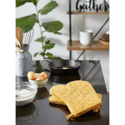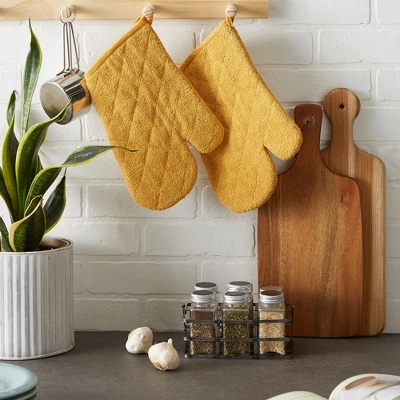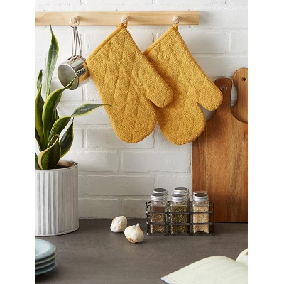 - Set of 2 oven mitts, each measure 7 x 13 inch. Hanging loop allows for easy storage when not in use.