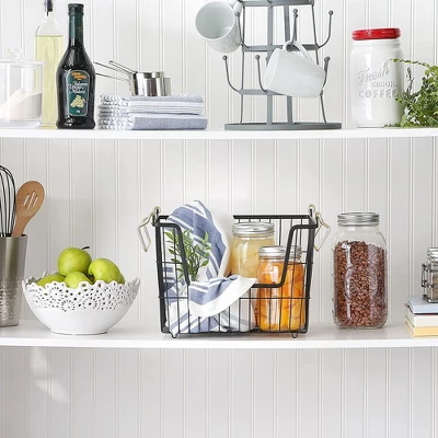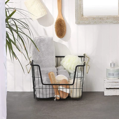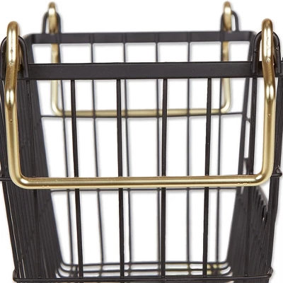 Reorganize your home with style using the DII Design Imports Medium-Sized Wire Mesh Stackable Utility Storage Bin in Black and Gold.This rectangular metal wire mesh storage basket is the perfect solution for bringing style and organization to any room in your home. Designed with versatility in mind, you can store anything from toys, books, and games to food, linens, and crafting supplies for a multifunctional home storage system that brings order and peace to your home. Perfect for storing potatoes, onions, canned goods, pantry items, flour, sugar, or any other dry goods while keeping them accessible and visible, you’ll love the organization this bin provides.Whether you’re bringing a sense of order to your kitchen pantry or tackling the playroom, living rooms, office, or cluttered closets, this bin is the ideal way to keep things easy to access while elevating your style and utilizing your space efficiently. The gold swinging handles add a touch of elegance and make transportation from room to room simple and comfortable.Upgrade your storage system with the Medium-Sized Wire Mesh Stackable Utility Storage Bin in Black and Gold from DII Design Imports.