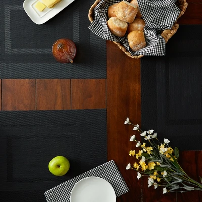 These vinyl double bordered set of 6 vinyl placemats measure 13 inches by 17.25 inches each and can be wiped clean with a damp sponge or cloth. The double border design can be dressed up or down and can be used indoors and outdoors. Our vinyl placemats are both functional and elegant. These beautifully woven placemats give a contemporary look to any tabletop. These placemats are timeless and pair well with modern tableware as well as with more traditional tableware. The double-sided weave pattern also makes it easy to switch up your table look by simply turning over your placemats. The beautifully finished edges and intricate weave pattern make these classic placemats perfect for any occasion.