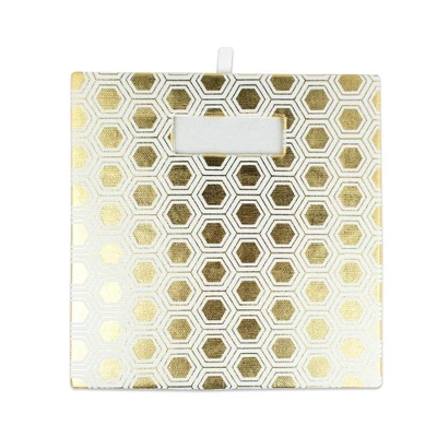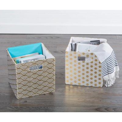 - Wrapped in polyester fabric, storage bins have a cardboard core on the sides and bottom to give shape and add structure while still allowing bins to fold flat when not in use.