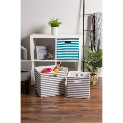 - Wrapped in polyester fabric, storage bins have a cardboard core on the sides and bottom to give shape and add structure while still allowing bins to fold flat when not in use.