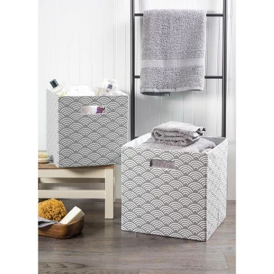 - Wrapped in polyester fabric, storage bins have a cardboard core on the sides and bottom to give shape and add structure while still allowing bins to fold flat when not in use.